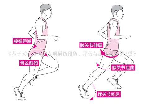 跑步时以髋关节伸展运动为中心,膝关节屈曲和踝关节跖屈运动产生的动力使运动员在地面稳步奔跑。但是当髋关节运动不充分时,需要通过腰椎伸展等多个关节运动维持前进推动力,过度使用会导致关节周围组织疾病。