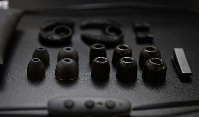 拆开包装,整个配件可以说是相当丰富齐全。包含6副不同尺寸的耳套,3对不同尺寸的耳撑,2个埋线夹、1个衣领夹、1条充电线、1个耳机收纳袋。